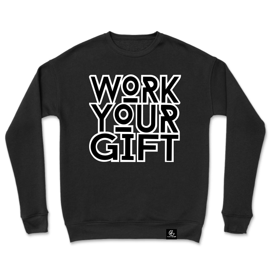 This fleece crewneck sweatshirt is a comfortable favorite all year around. 50/50 cotton poly blend boasts a 1x1 ribbed collar, cuffs and waistband with spandex. Show your commitment to WORK YOUR GIFT in comfort AND style.